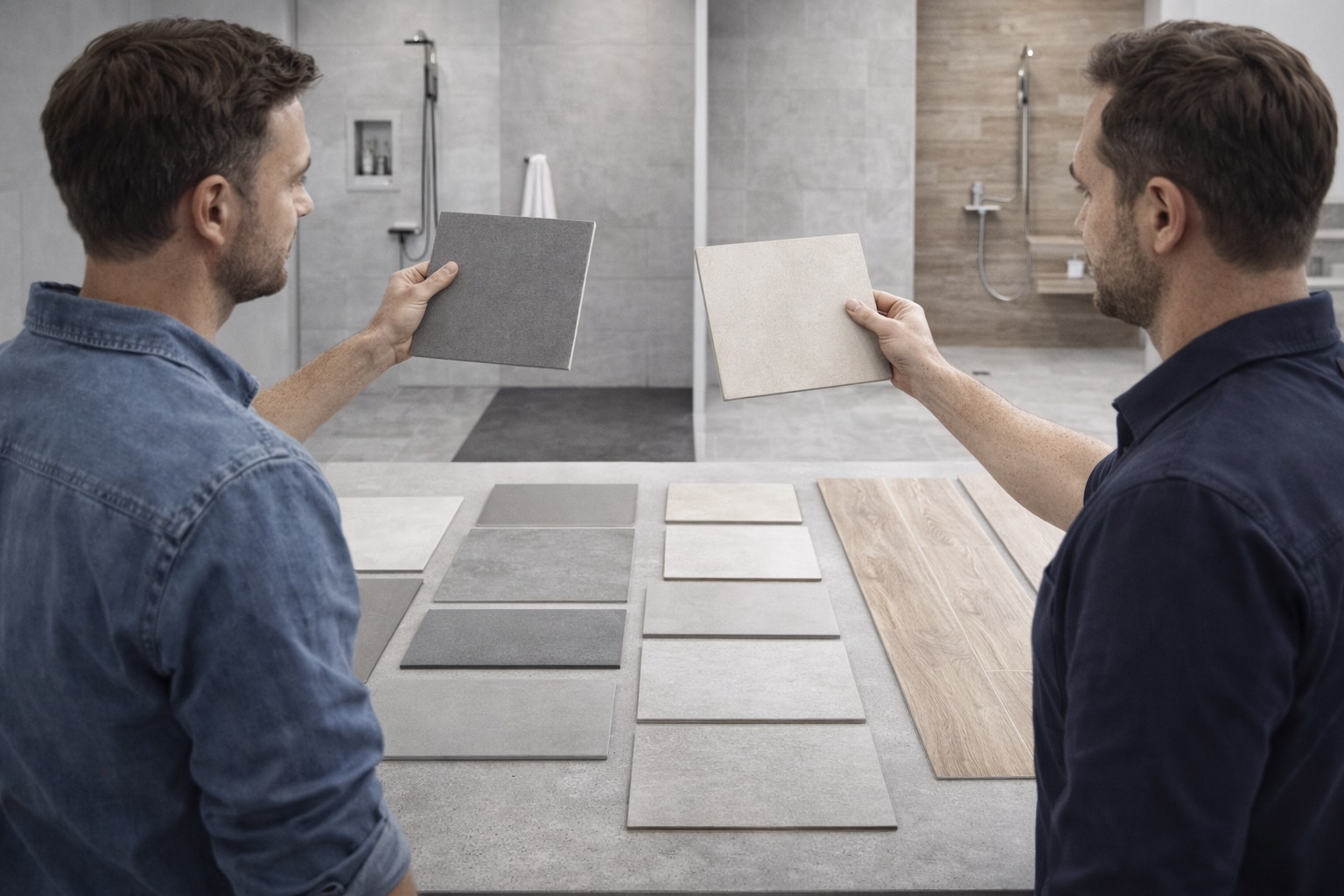 Auswahl passender Fliesentypen (Feinsteinzeug, Keramik, Naturstein) je nach Beanspruchung, Rutschhemmung und Design.