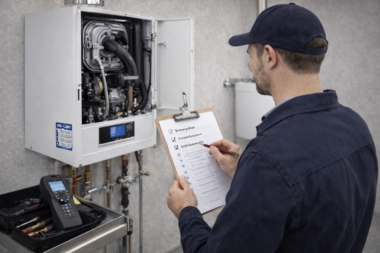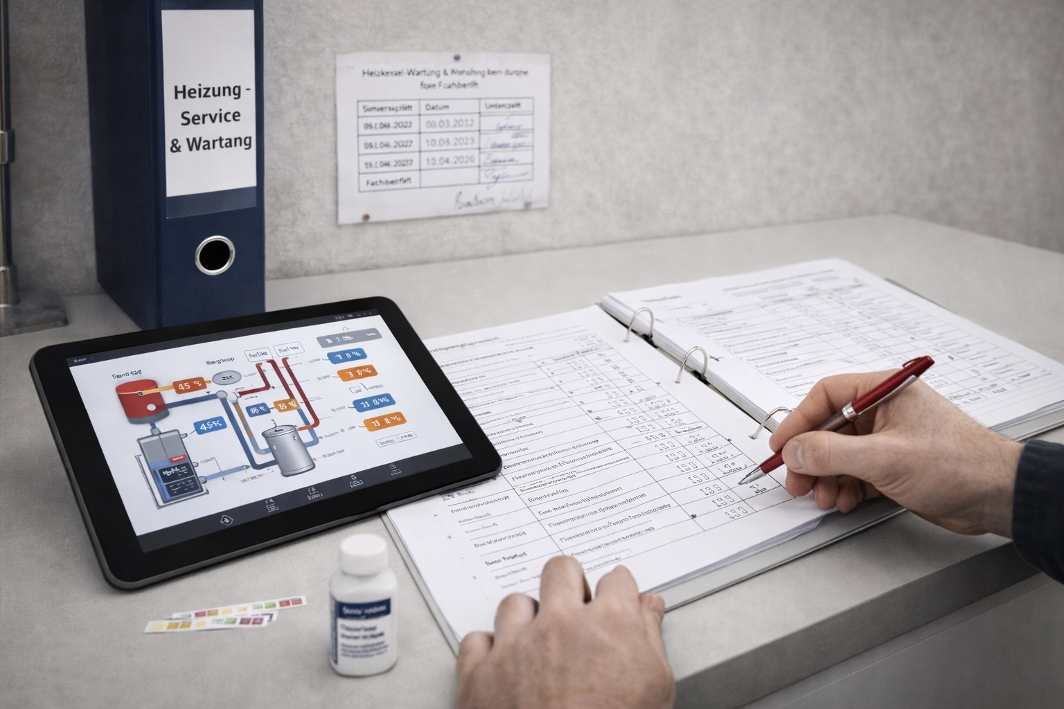 Jährliche oder vom Hersteller empfohlene Wartung von Wärmeerzeuger, Brenner, Wärmetauscher, Pumpen und Sicherheitseinrichtungen.